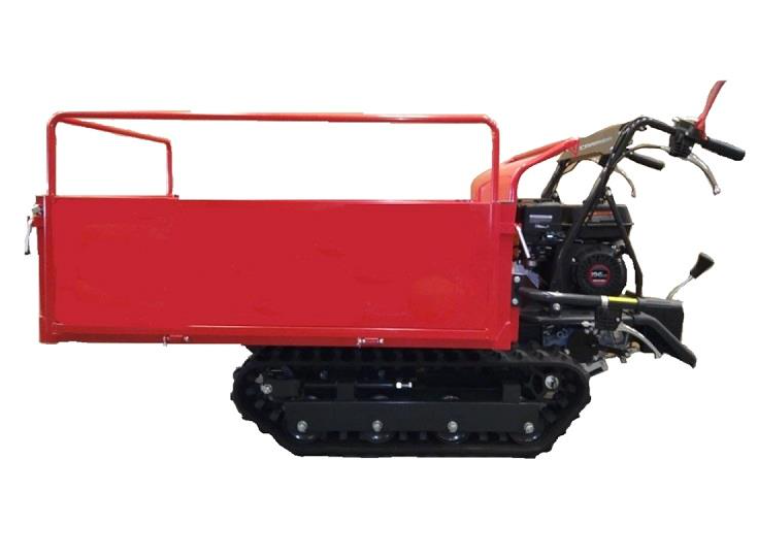 Motor modelo LONCIN (4T), potencia 208 cc / 9 CV. arranque manual, transmisión tipo mecánica, sistema de giro por bloqueo, embrage por correa, velocidades 8 vel. - (6 Adelante + 2 Atras), plataforma basculante accionamiento hidráulico, capac. carga - en terreno llano 500 Kg. capac. carga - en pdtes. super al 30º - 400 Kg.(MAX.), medidas de la plataforma abierta (L x A x h) 90 x 120 x 35 cm. cerrada (L x A x h) 70 x 110 x 35, tracción tipo orugas de goma, medida de las orugas 180 (Ancho) x 60 (Paso) x 34 (Dientes), tensado de las orugas mediante muelle, peso (En vacio) 255 Kg. dimens. - sin caja de carga - (L x A x h) 70 x 197 x 97 cm. nivel sonoro 103 dB, 2 años de garantía oficial VG CARRIER, servicio técnico propio.