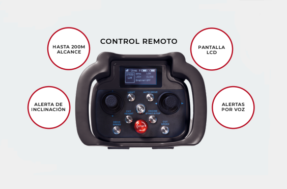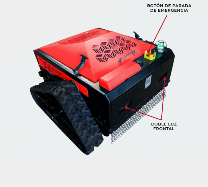Motor ZONGSHEN de 452 c.c. batería integrada de 24 V. voltaje de carga 110 V – 220 V. potencia del motor 800 W. ancho de corte 27” / 685 mm. sistema de corte cuchilla de eje (spindle shaft), altura de corte 30 mm – 120 mm (ajustable), sistema de tracción por orugas de goma reforzada de alta durabilidad, rotación 360°, ARRANQUE / PARADA manual y por control remoto, velicidad máxima 47 m/min. inclinación máxima 45°, peso 245 kg. dimensiones 990 × 1090 × 610 mm. boton de parada de emergencia, doble luz frontal, alcance remoto hasta 200 m, alerta de inclinación, pantalla LCD, alertas por voz, 2 años de garantía oficial VG GREEN, servicio técnico propio.